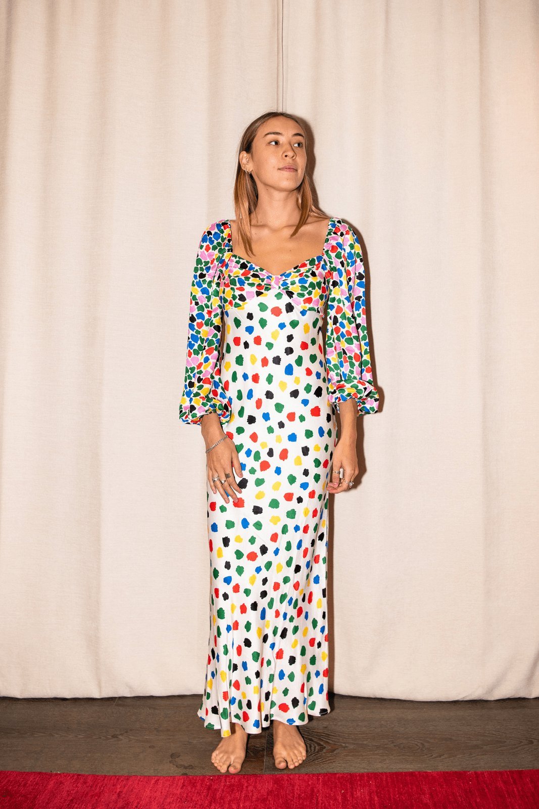 - Introducing our chic and vintage-inspired satin maxi dress. Adorned with vibrant, printed colorful dots, this dress features a sweetheart neckline and long balloon sleeves for a touch of elegance. Its flowy and breezy style makes it perfect for daily occasions, brunches, or nights out. Embrace timeless fashion with this must-have addition to your wardrobe.