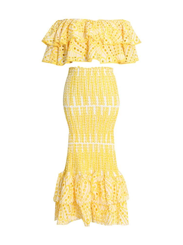 - The Two-piece set includes a multi-way top and an ankle-length skirt, for the top you can wear either off-shoulder or one-shoulder.