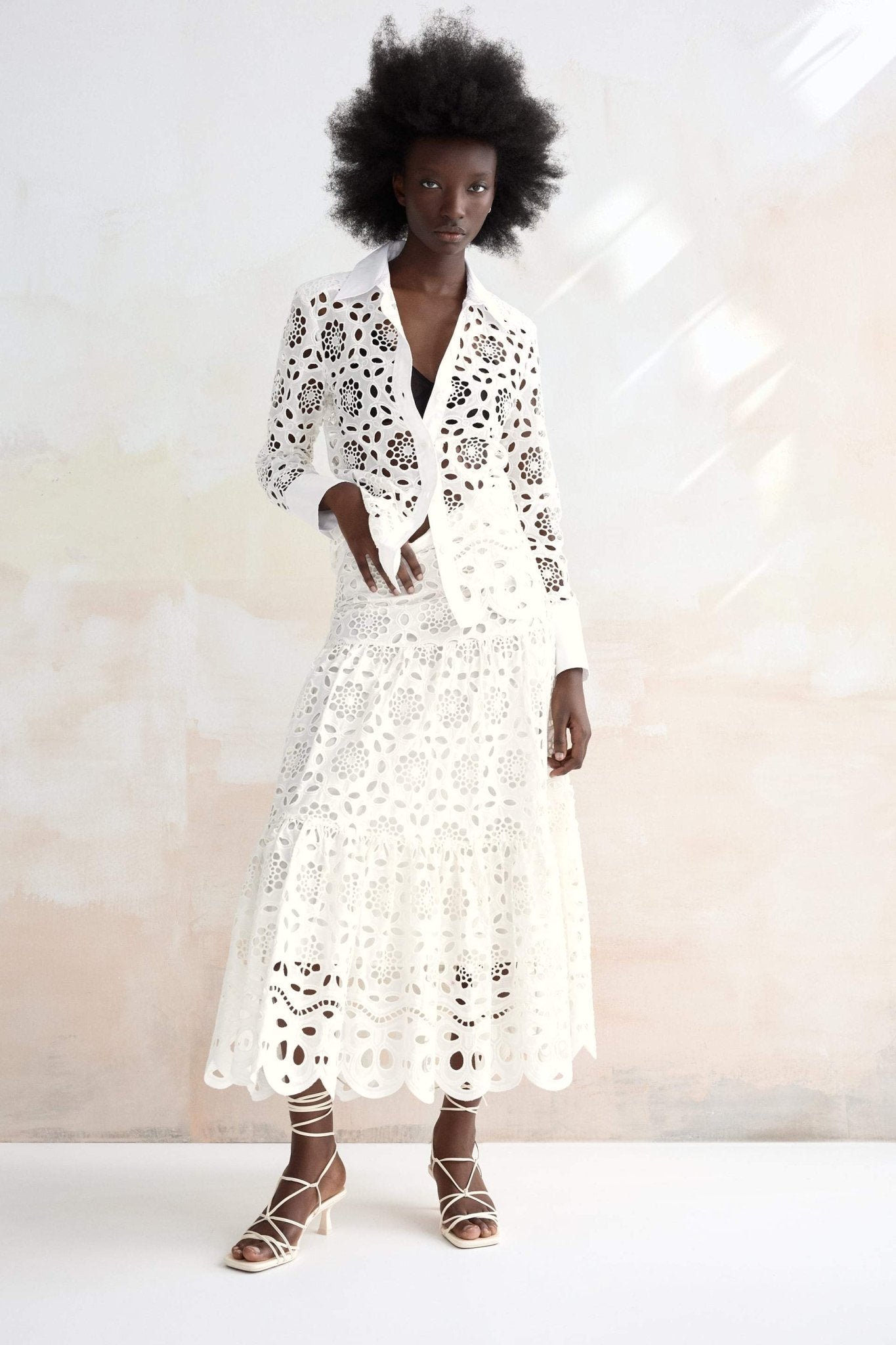 - Embroidered Lace, Cut-out Design, Yoke Blouse, A-line Skirt.