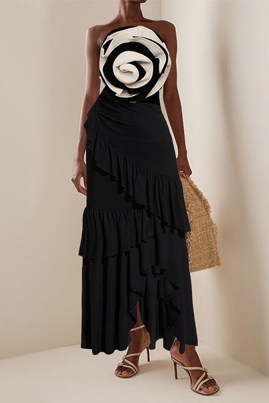 - Bodysuit, Ruffle Skirt, 3D Flower Decored, Black & White.