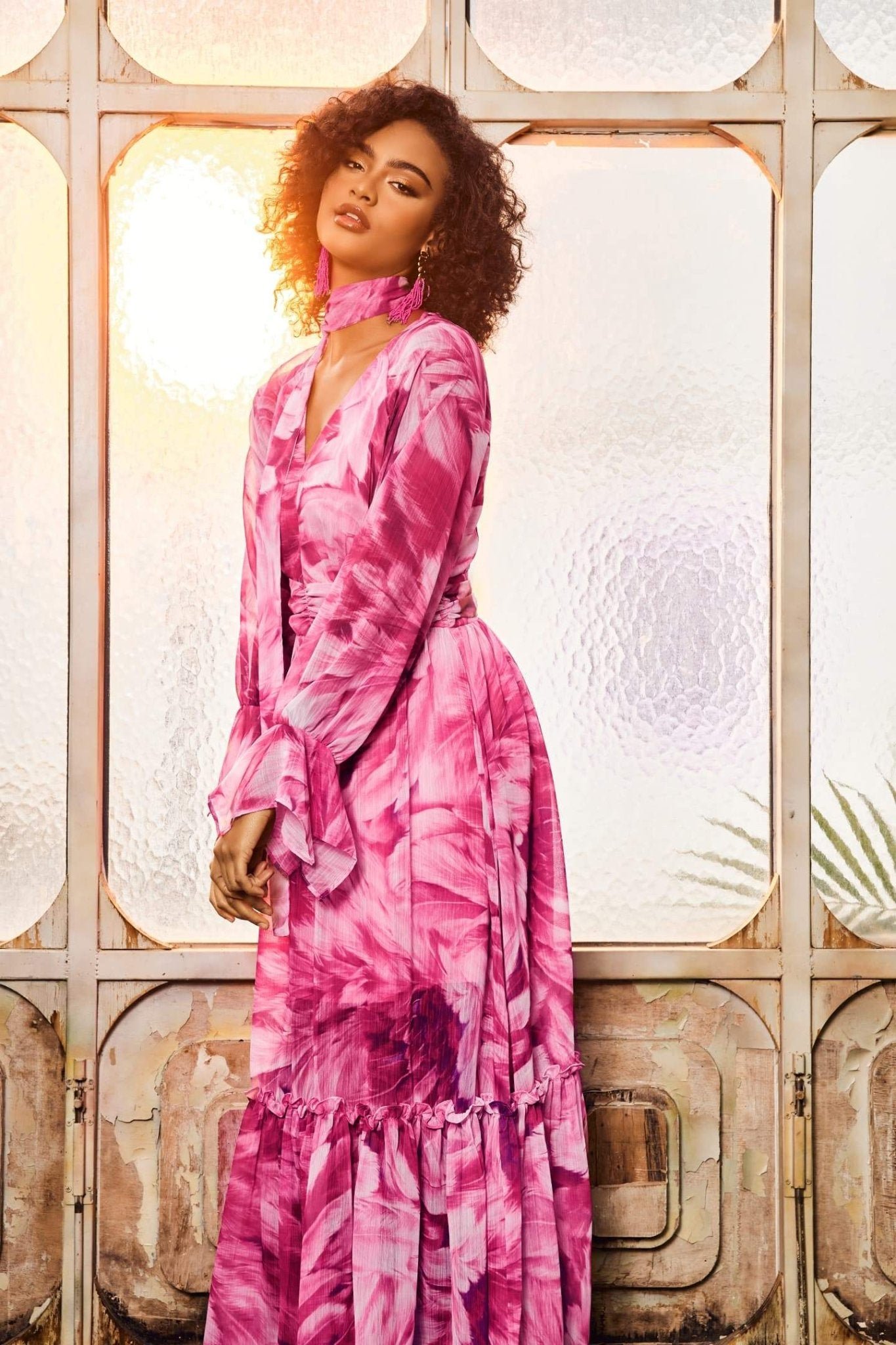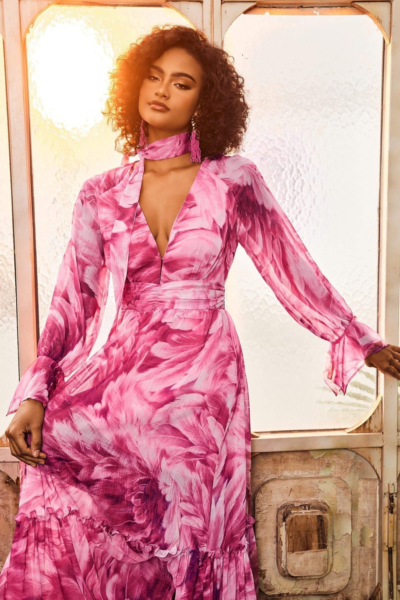 - Deep V-neck, Feather-inspired Designs, Asymmetric Hems, Scarf Included, Maxi Length.