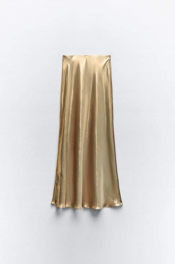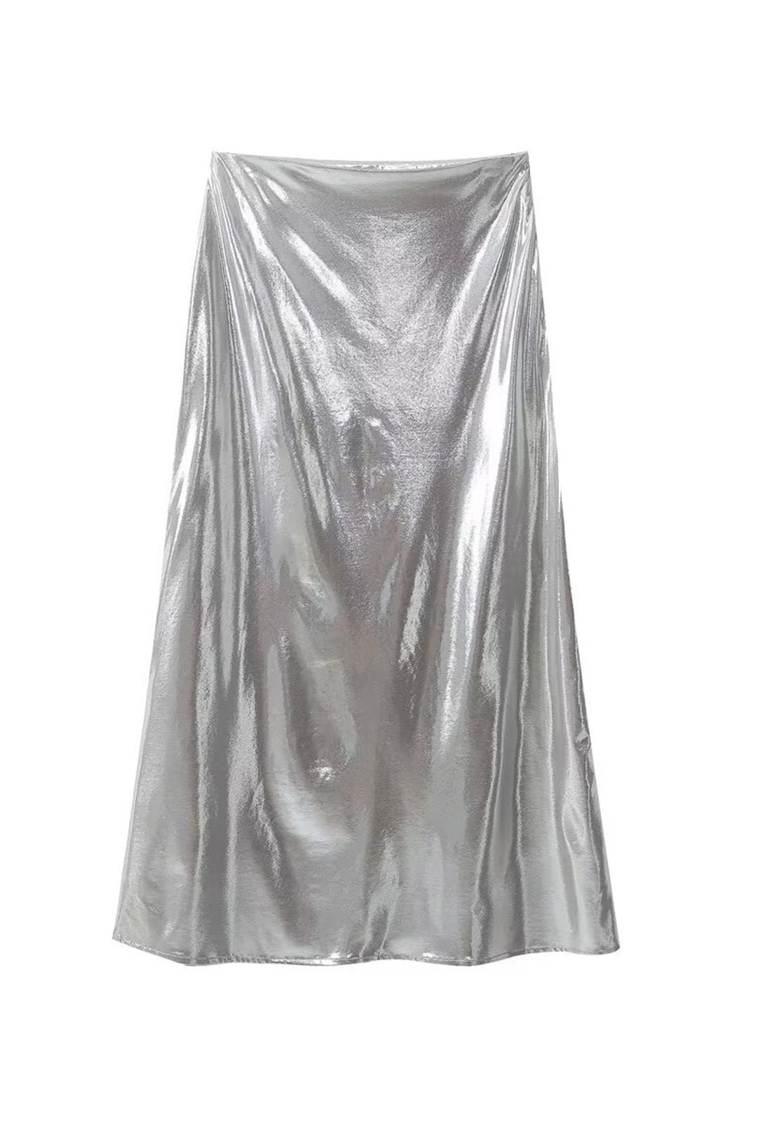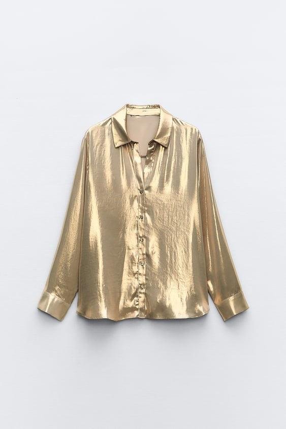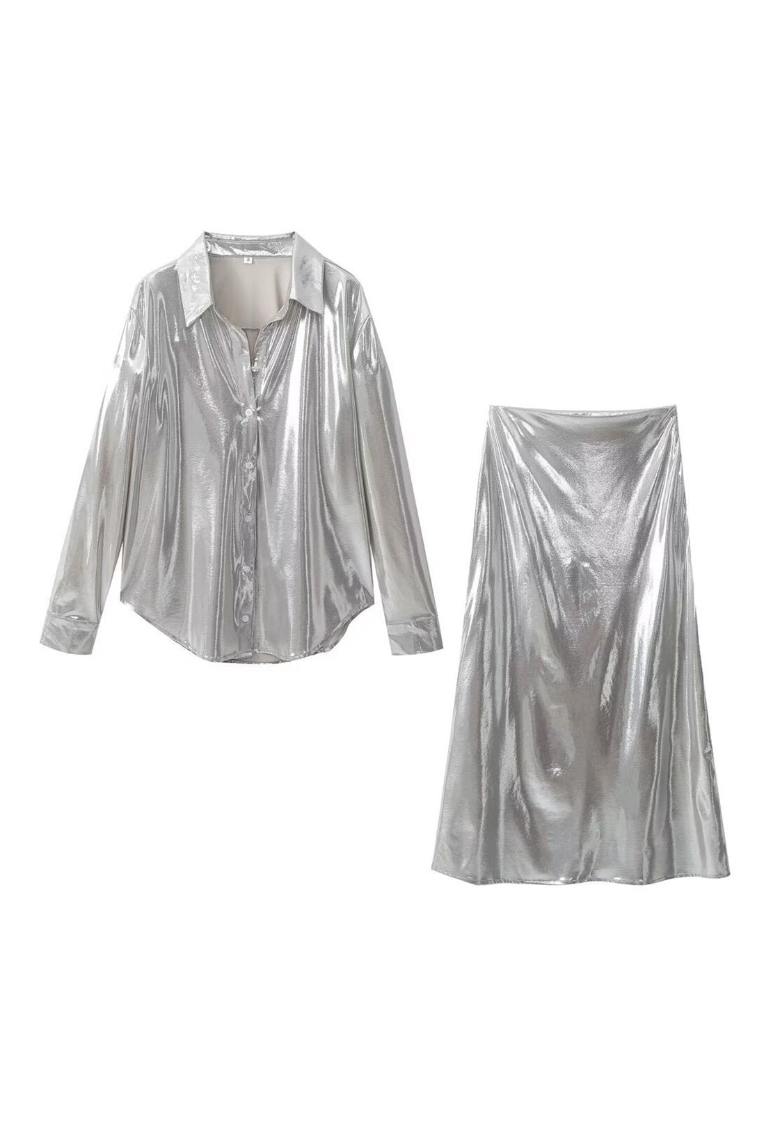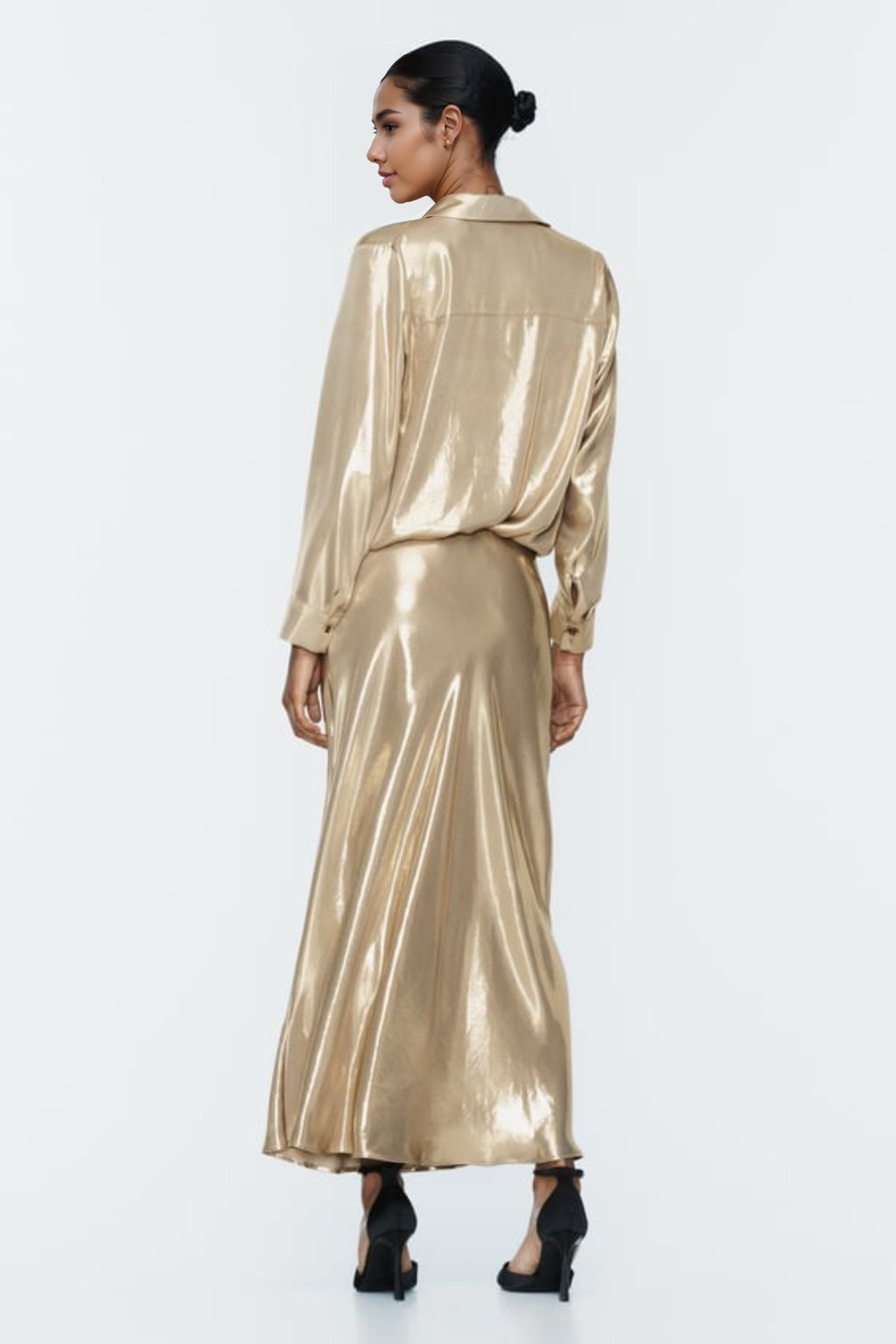 - Collared Shirt, Silky Satin, Long sleeves, Flare Hem, Long Skirt.