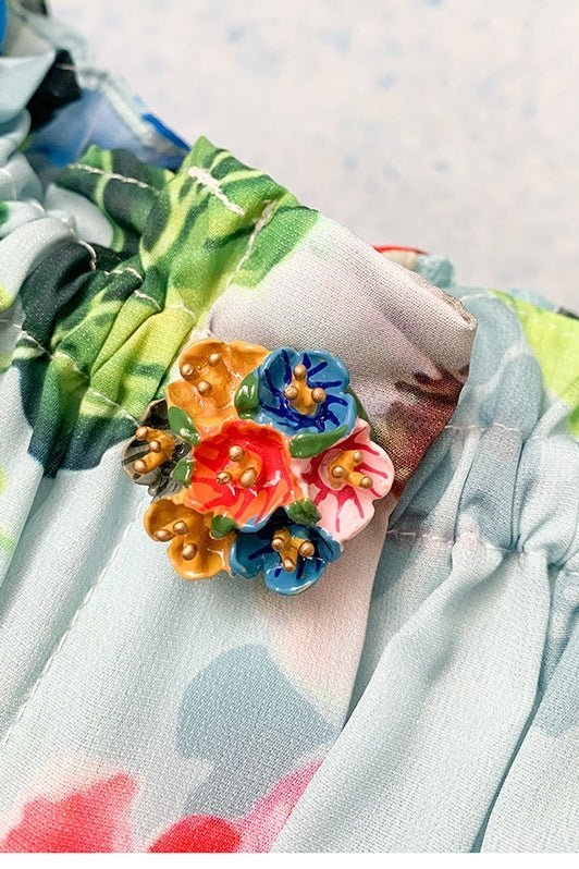 - Floral Printed, Shirred Waist & Neckline, Ruffled Bodice, Two-Way Wearing(Off-shoulder/Short Sleeve), Flare Dress, Intricate Decored Buttons.