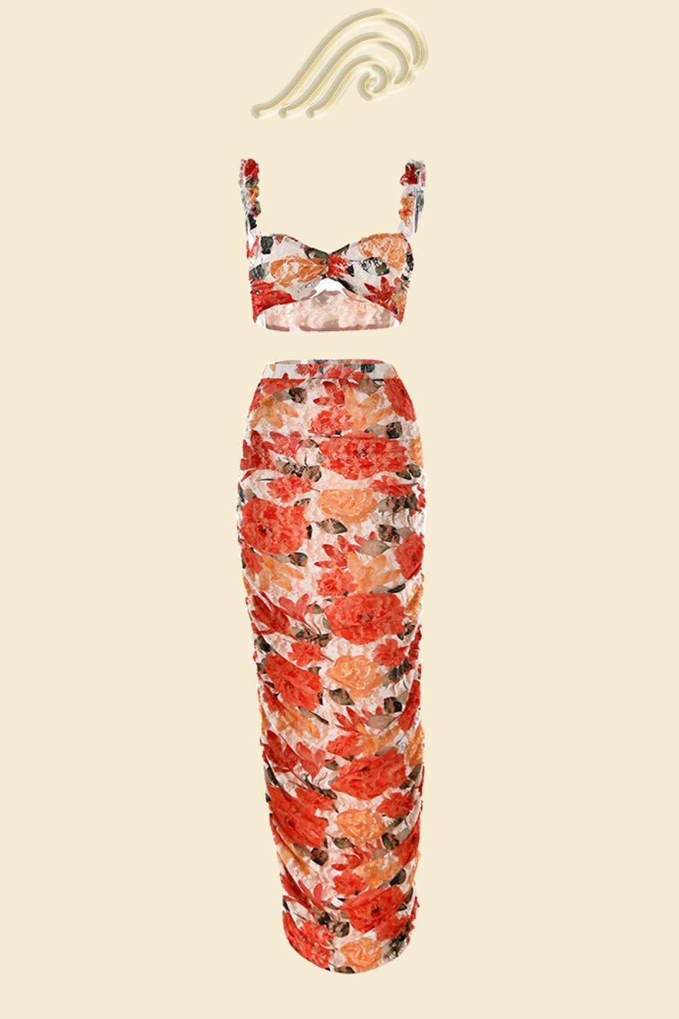 - Floral Printed Lace, Sweetheart Neckline, Ruffle Gathered Strap, Gathered Skirt, Elastic Waistband, Floor Length.