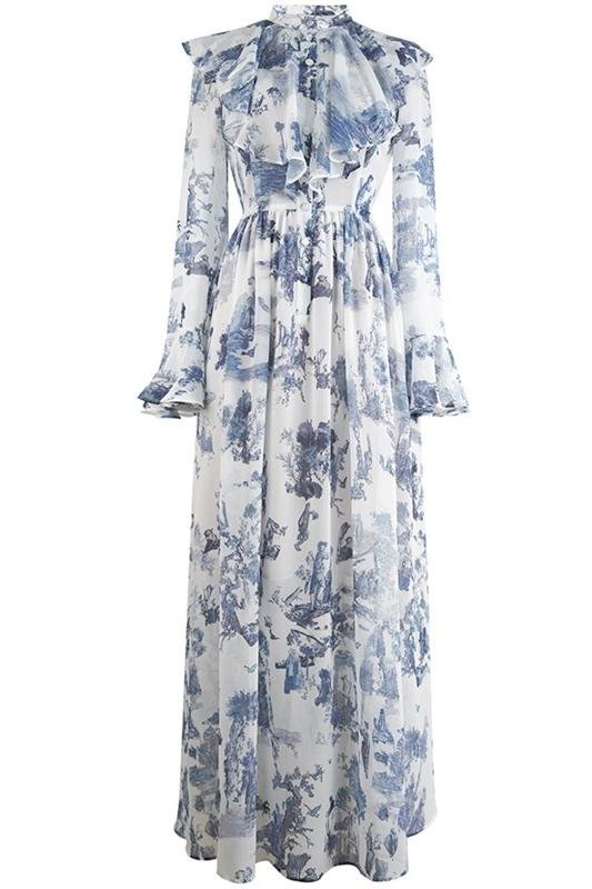 - Toile de Jouy Print, Ruffle Collar, Flare Sleeves, Flare Hem, Ankle Length.