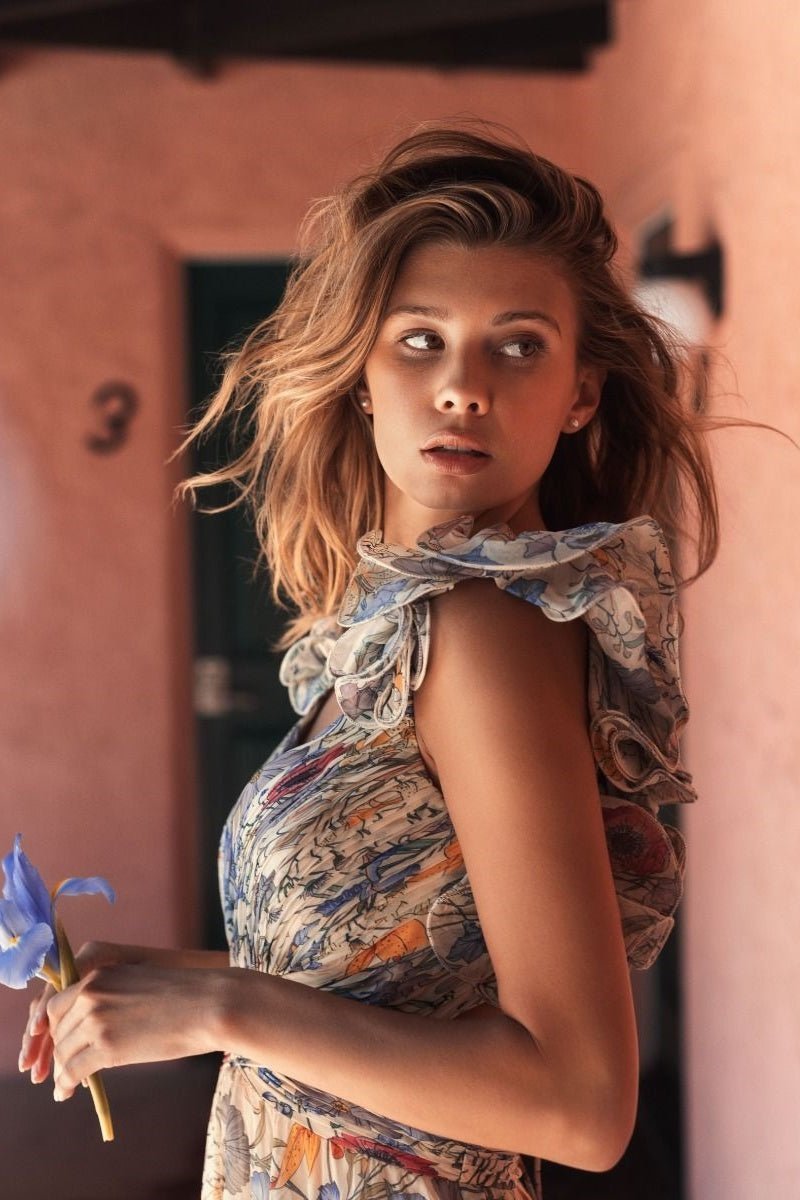 - Flutter-Sleeve, Deep V-neckline, Floral Print, Strappy Lace-up Open Back, Maxi Length.