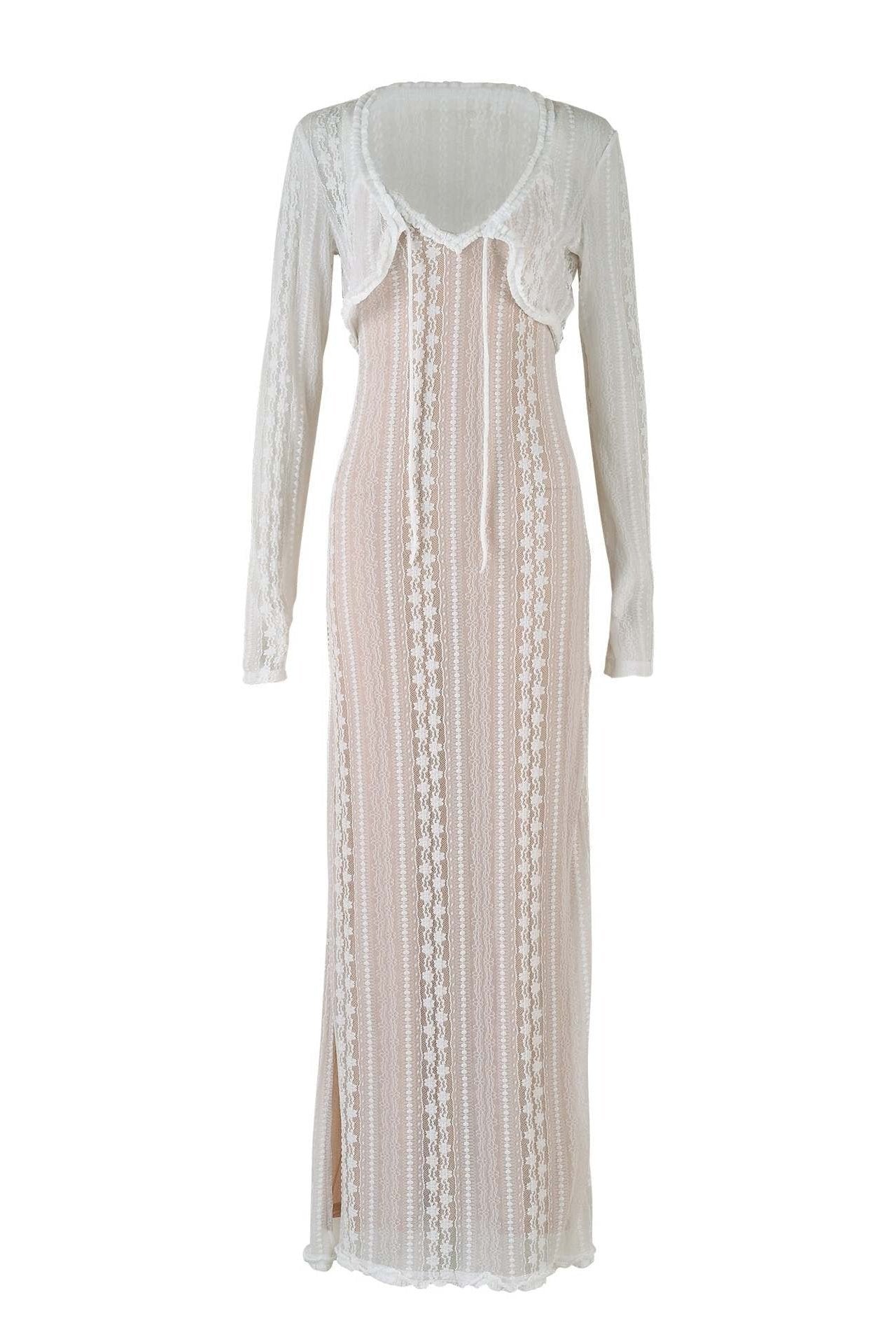 - Deep V Neckline, Side Seam Split, Adjustable Shoulder Straps, Removable Cropped Cardigan.