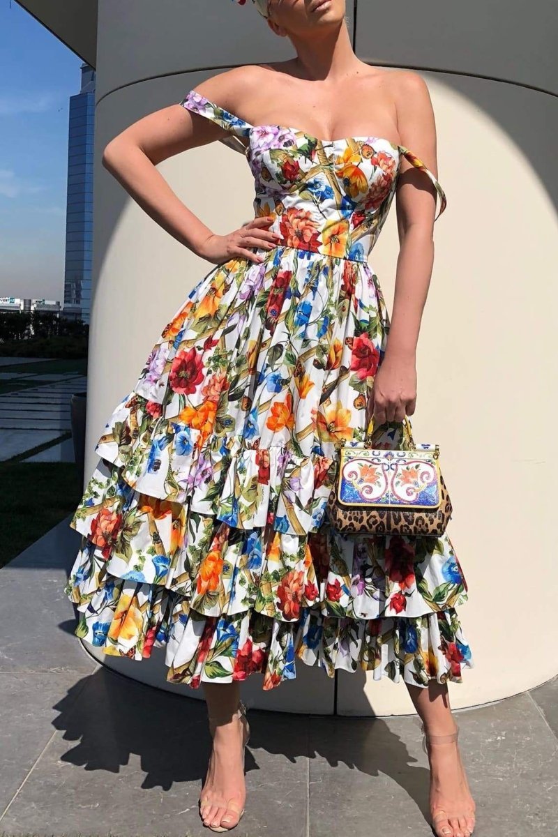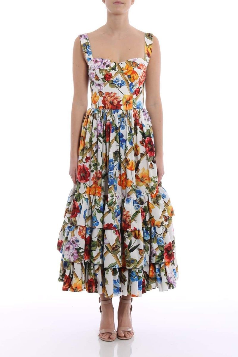- Tiered Ruffled Hem, Pleated Skirt Panels, All Over Floral Print, Wide Shoulder Straps, Midi Length.
