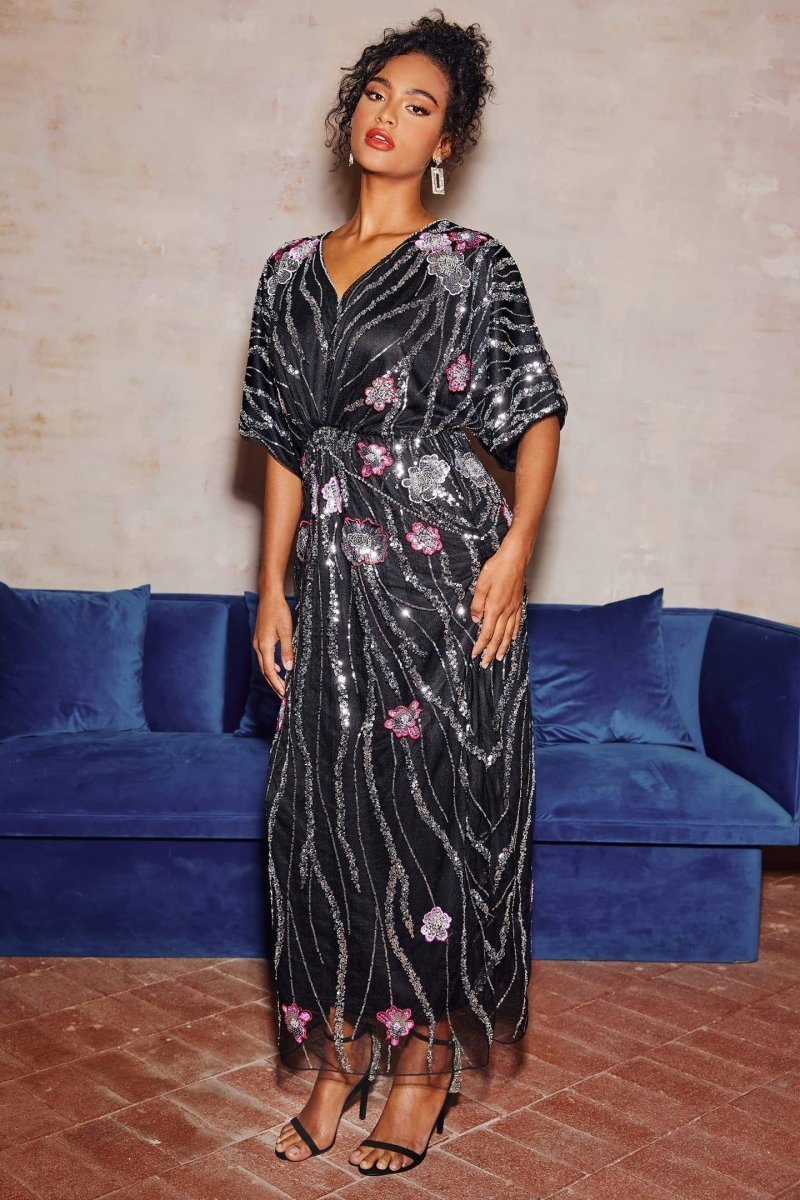 - Short Sleeve, V-neckline, Embroidered Floral, Sequins Details, Maxi Length.