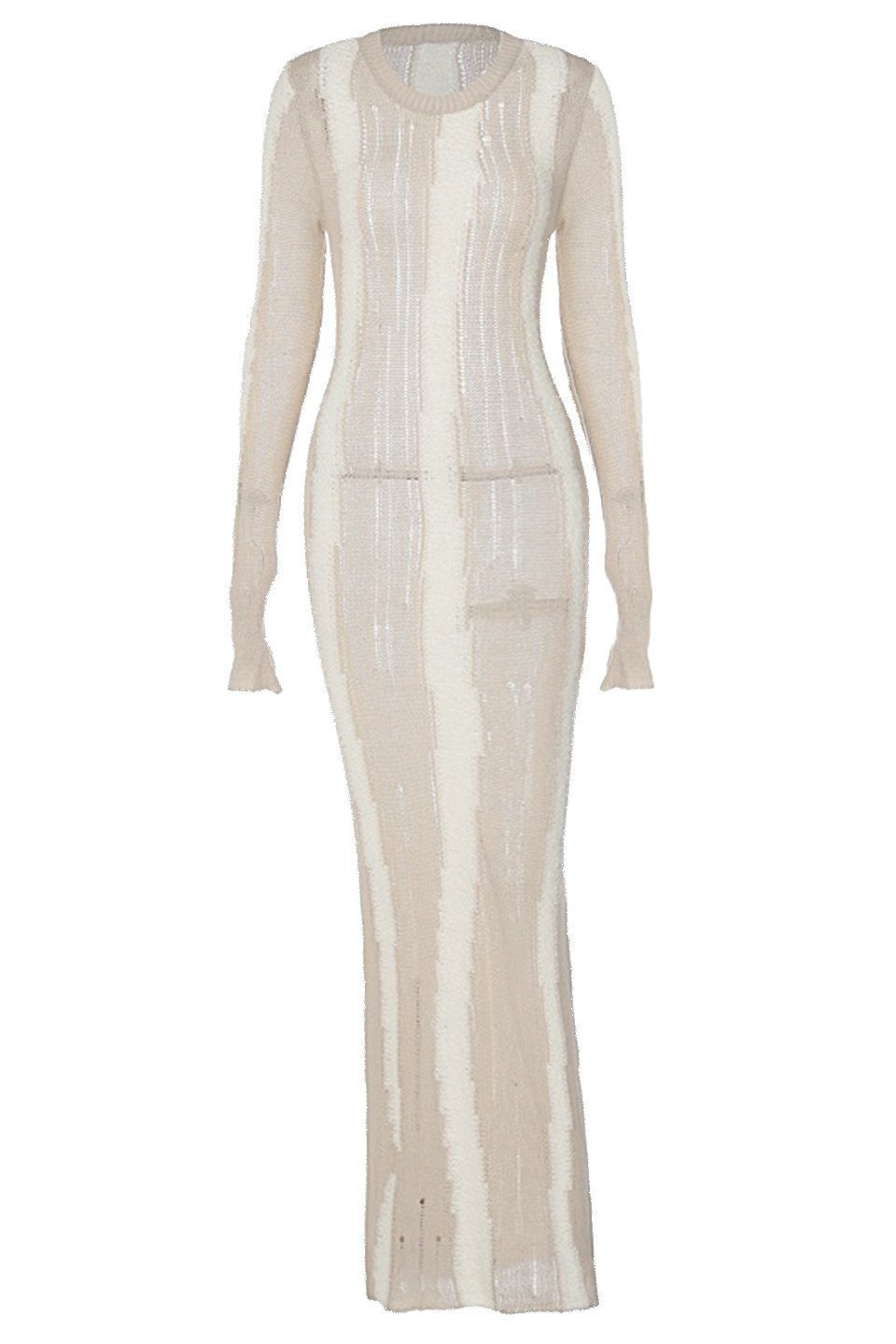 - Crew Neck, Flare Hem, Flare Sleeves, Splicing Textured Knit, See-through, Maxi length.