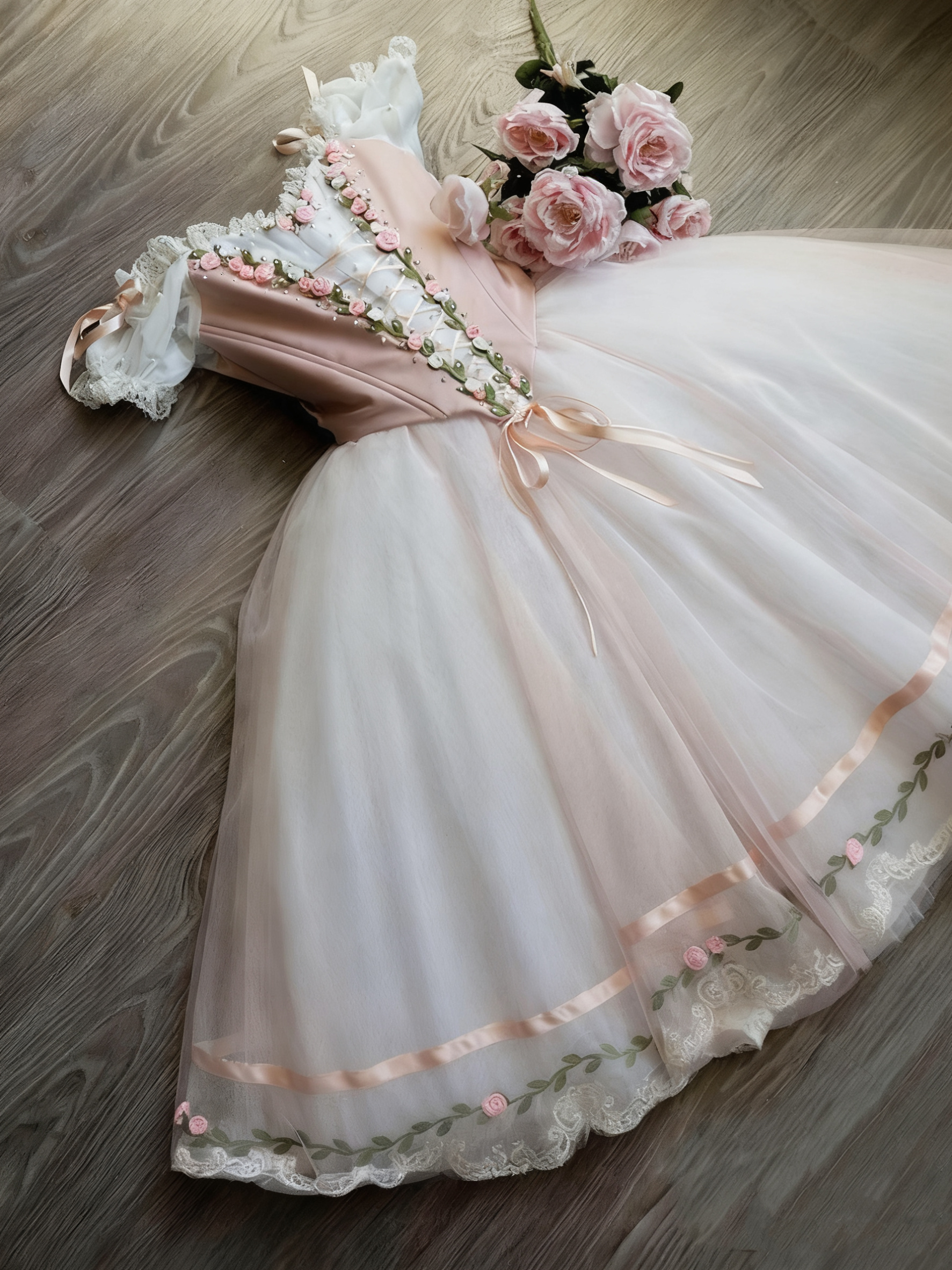 amakanas-Vintage Pink 3D Floral Lace-Up Lace Tiered Tulle Court Style Dress gh6012