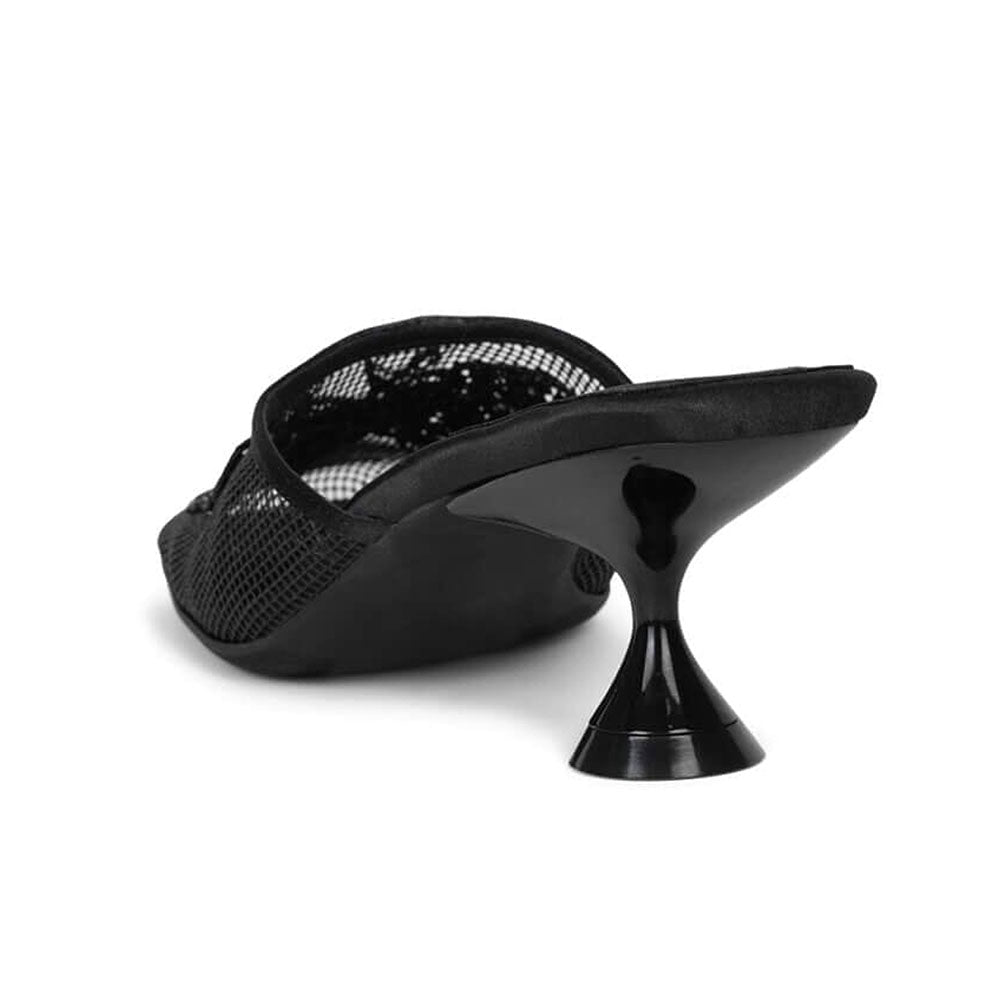 Black Fishnet Square Toe Kitten Heel Sequin Wide Band Mules Shoes