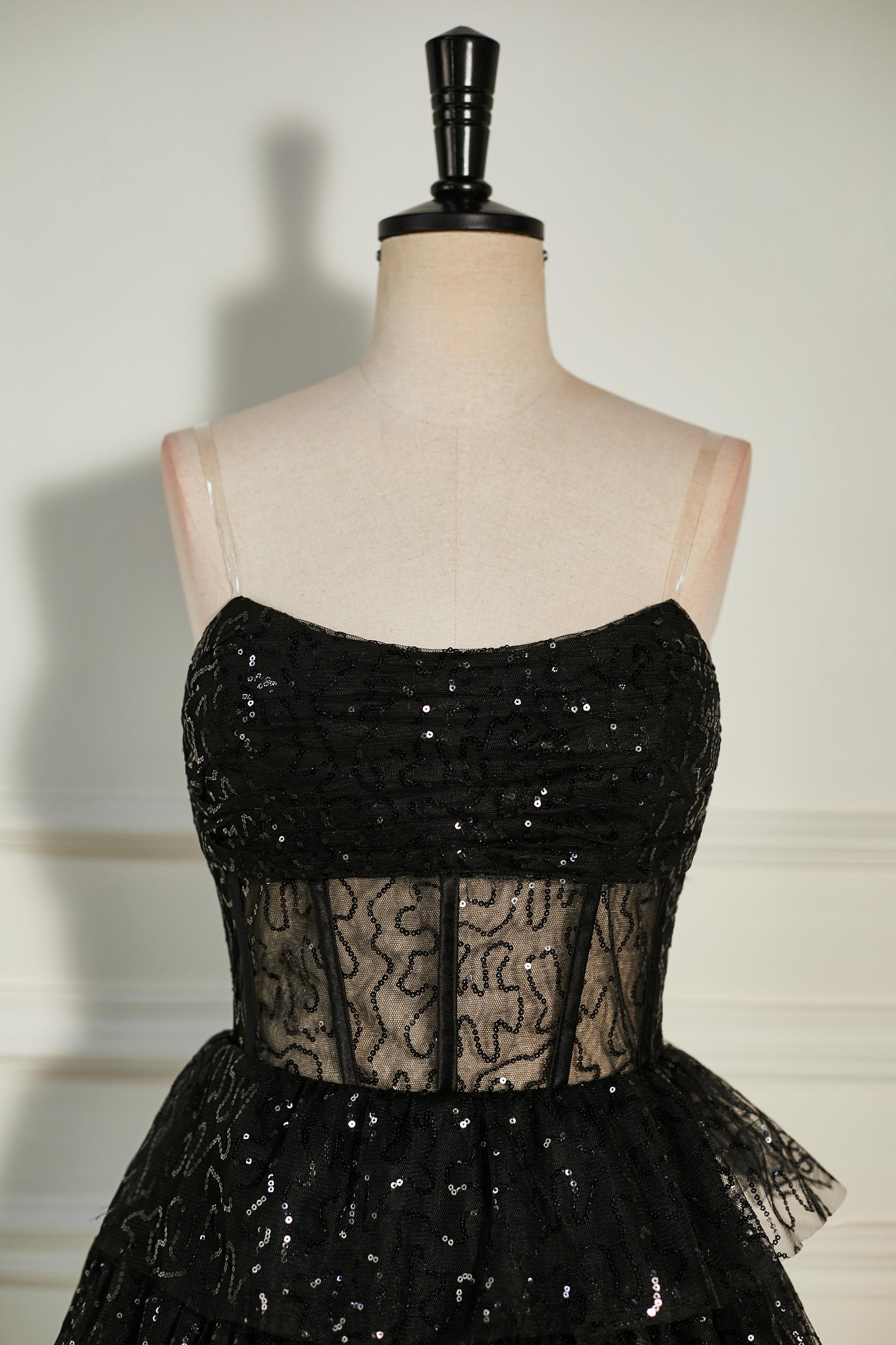 Black Sequined Strapless Multi-Layers Tulle Cocktail Dress