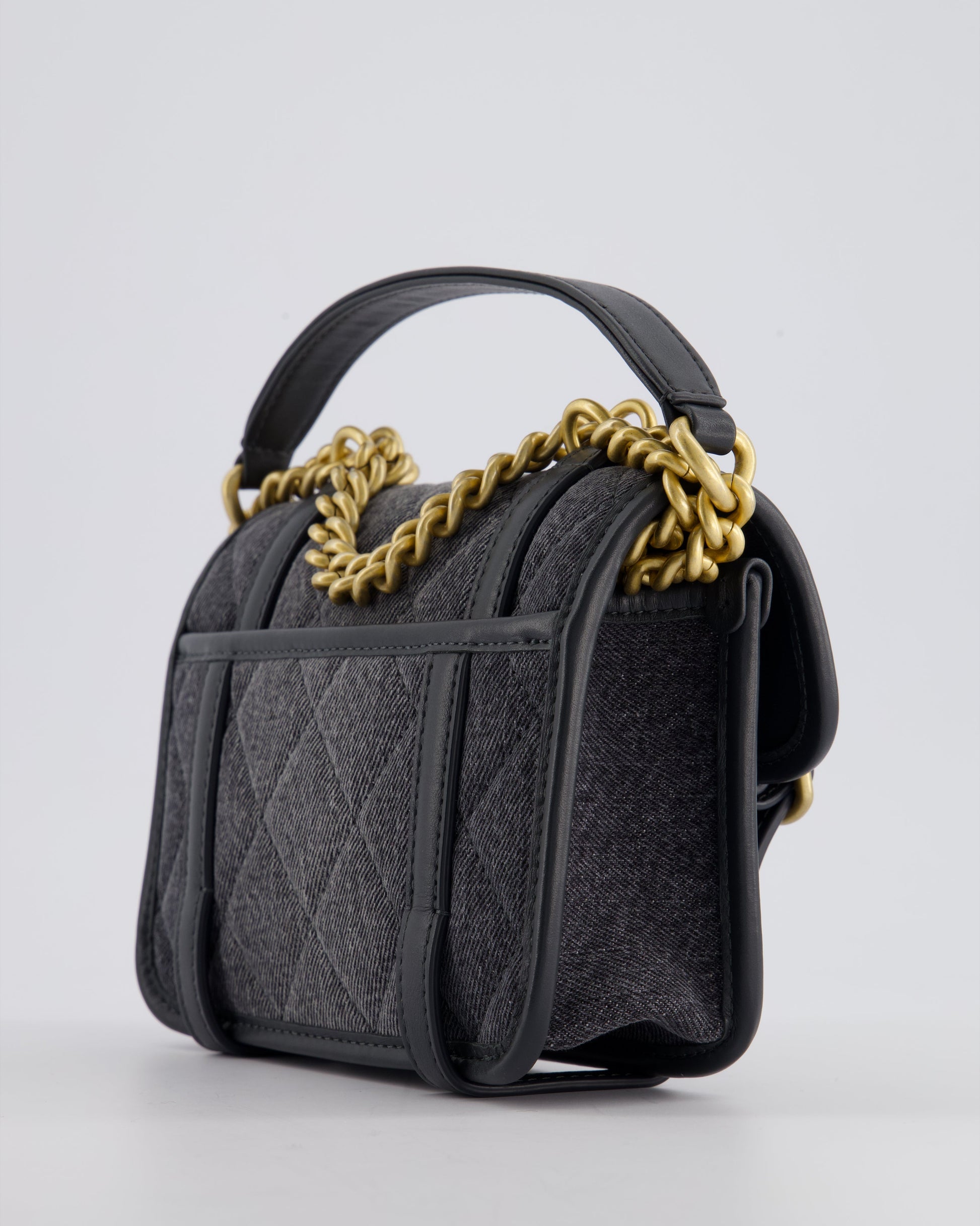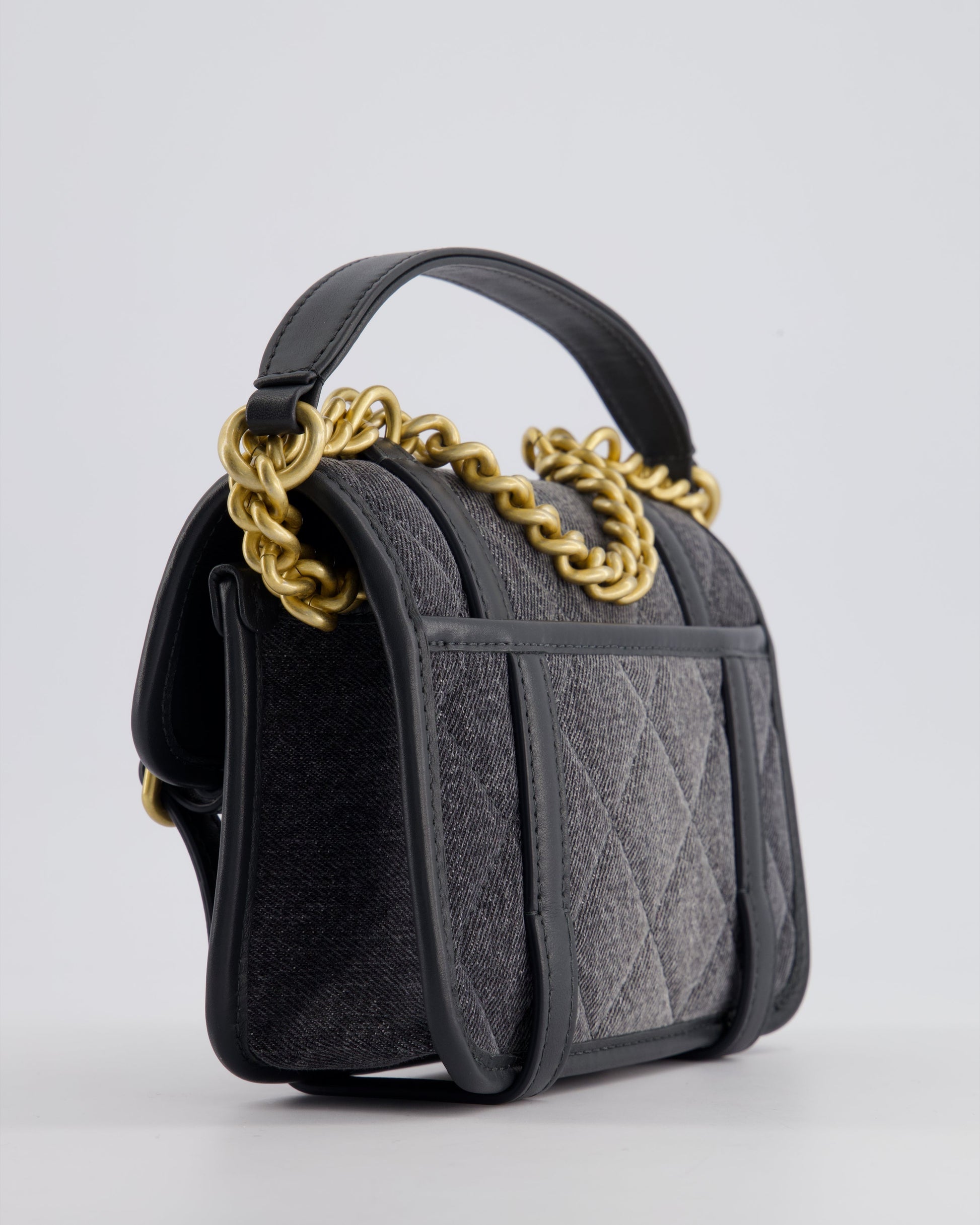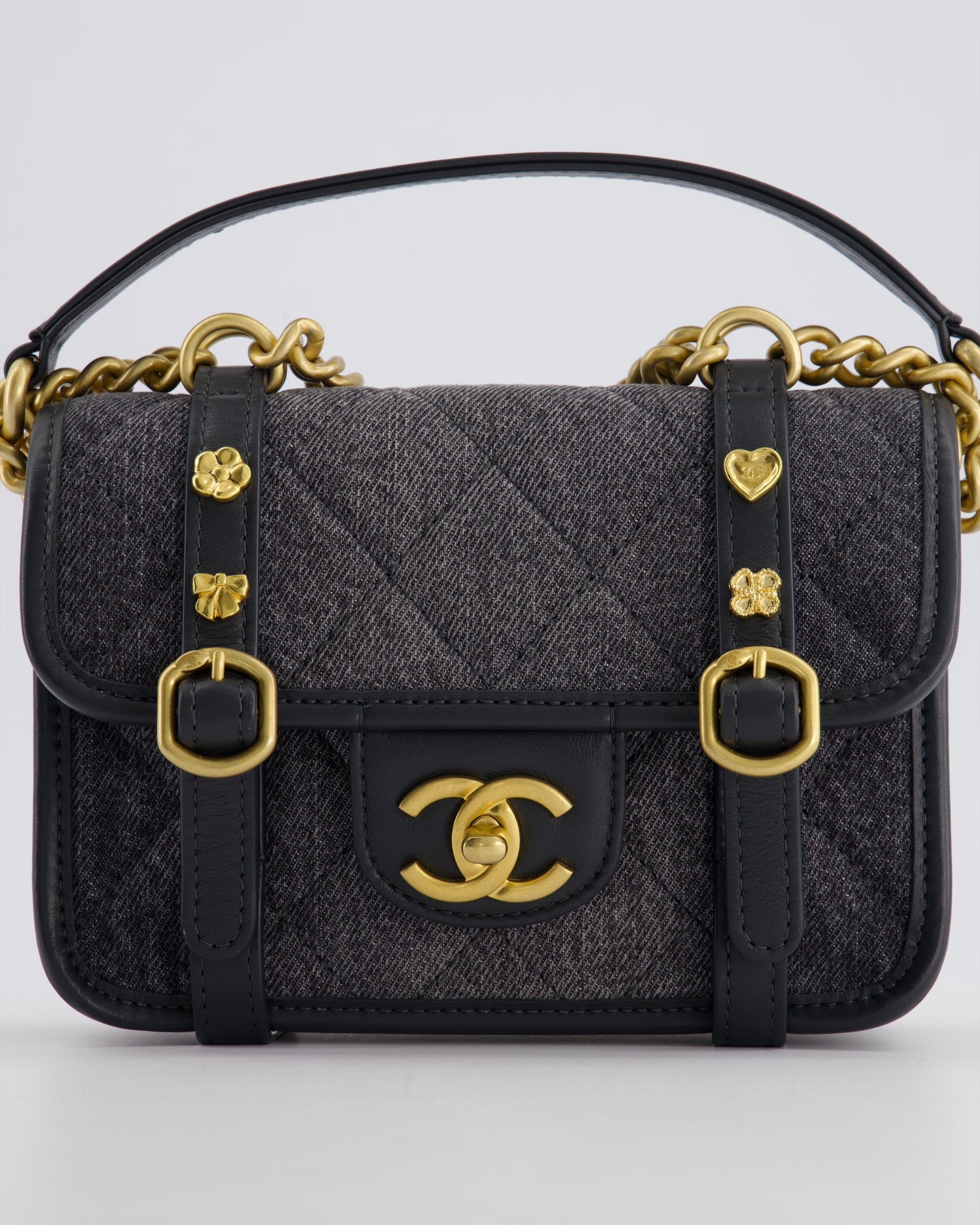 Chanel Grey Mini Denim Flap Bag with Brushed Gold Hardware and Charm Detail