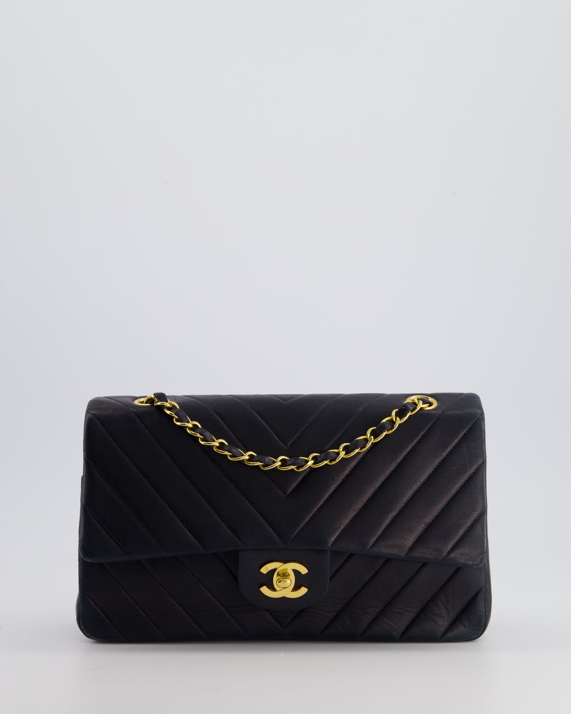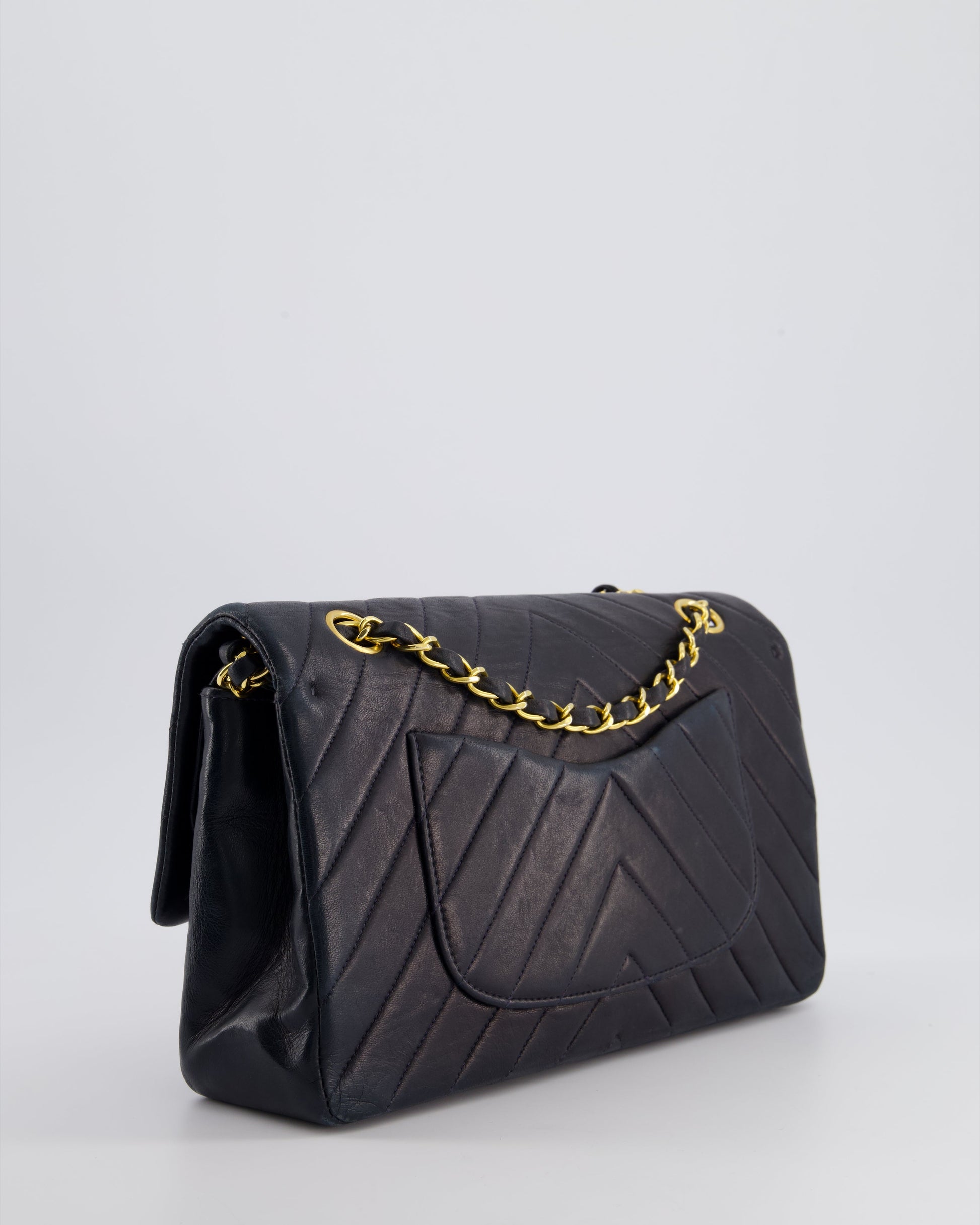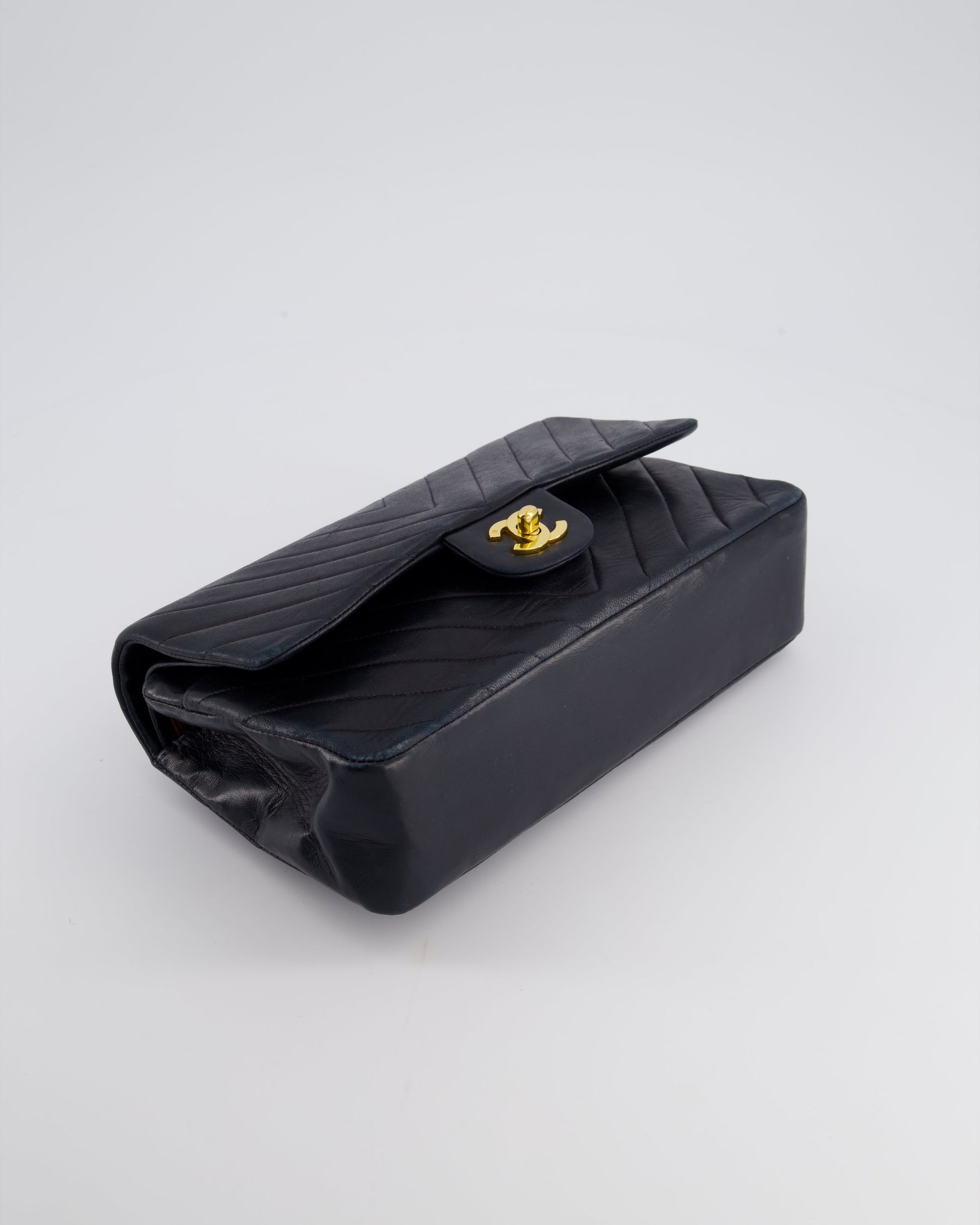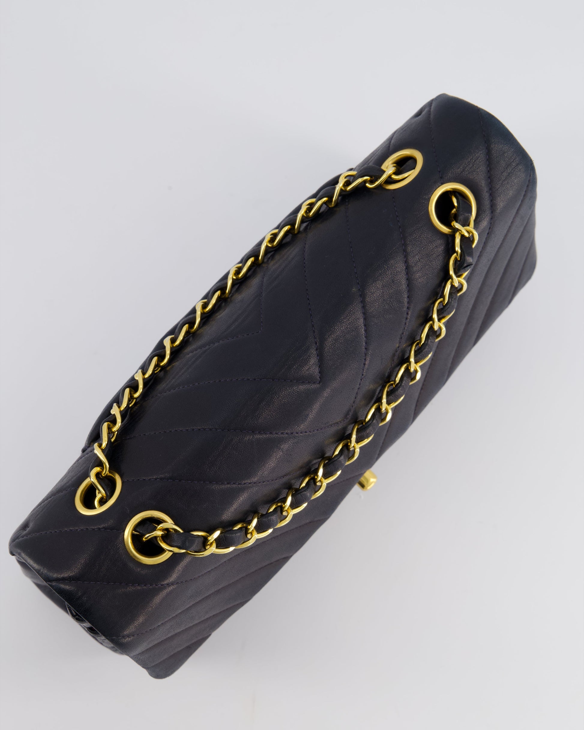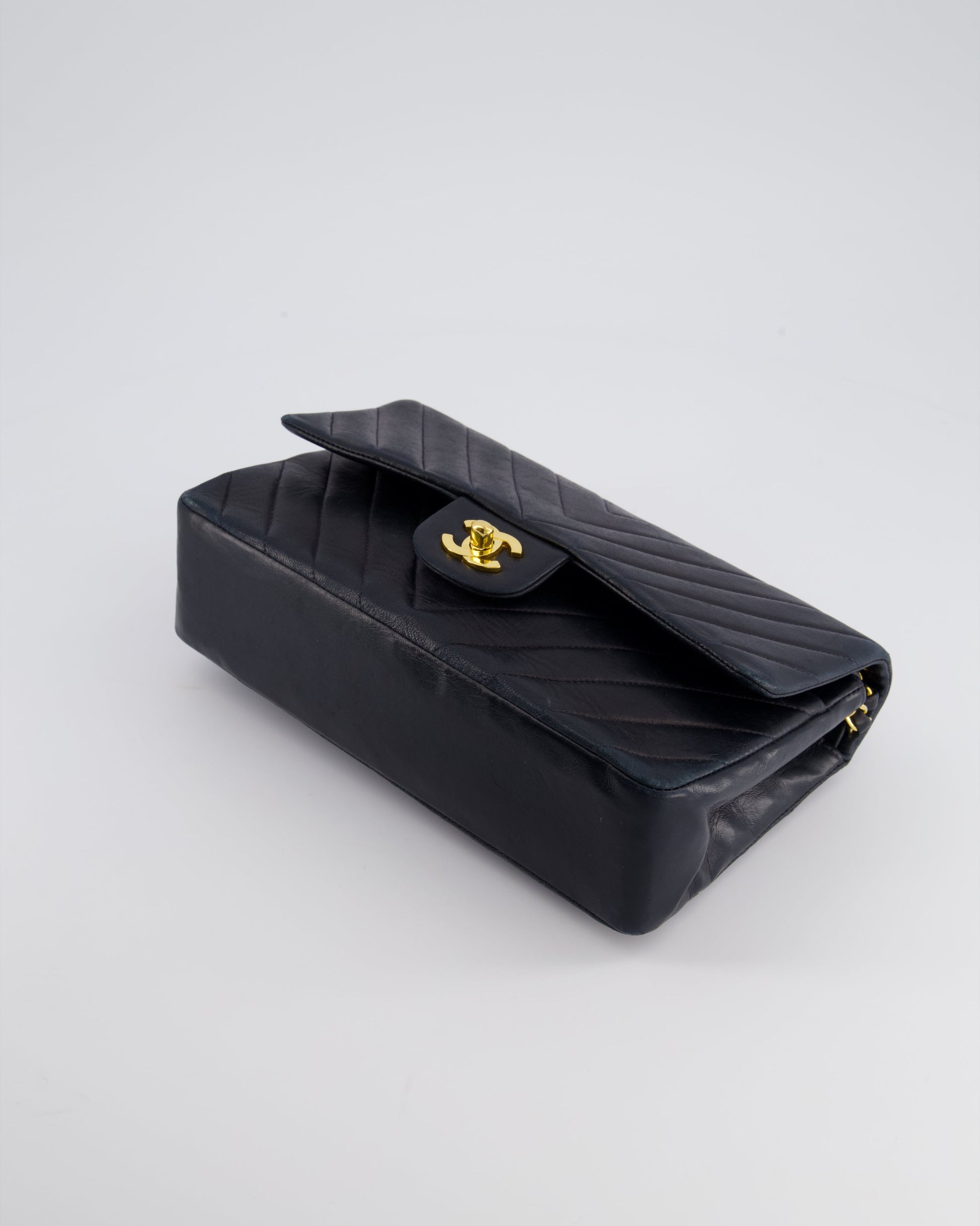 Chanel Navy Vintage Classic Medium Chevron Double Flap Bag in Lambskin Leather with 24K Gold Hardware