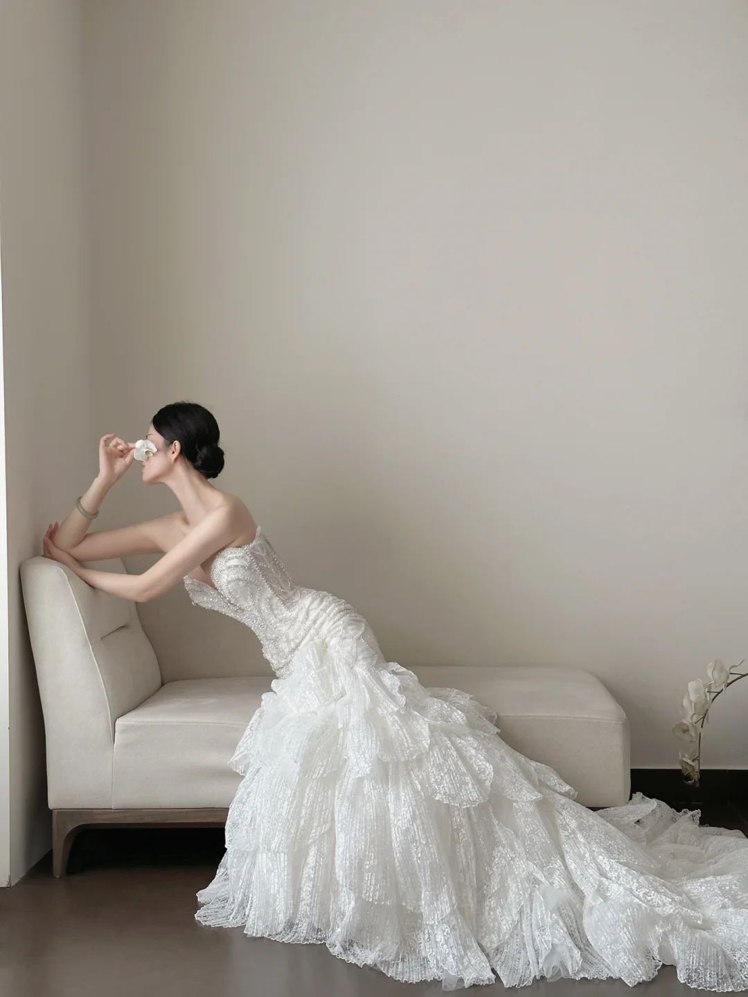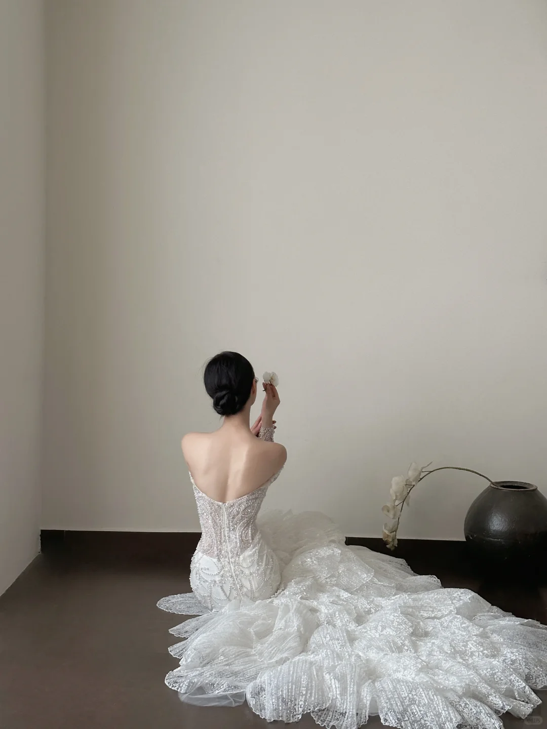 Delicate Mermaid Strapless Lace Beaded Long Sleeves Long Prom Dress, Wedding Dress, Evening Dress GG2840