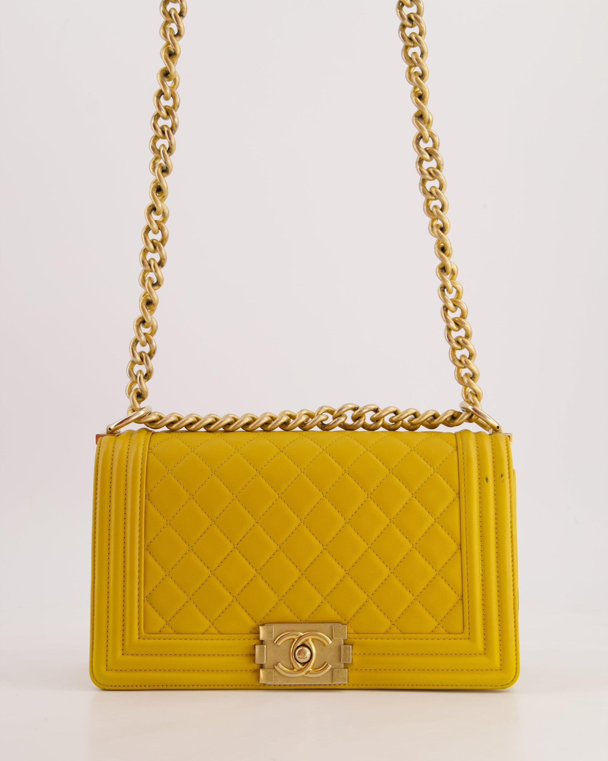 Chanel Mustard Yellow Medium Boy Bag in Calfskin Leather with Antique Gold Hardware