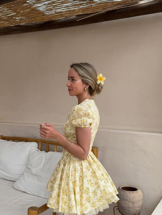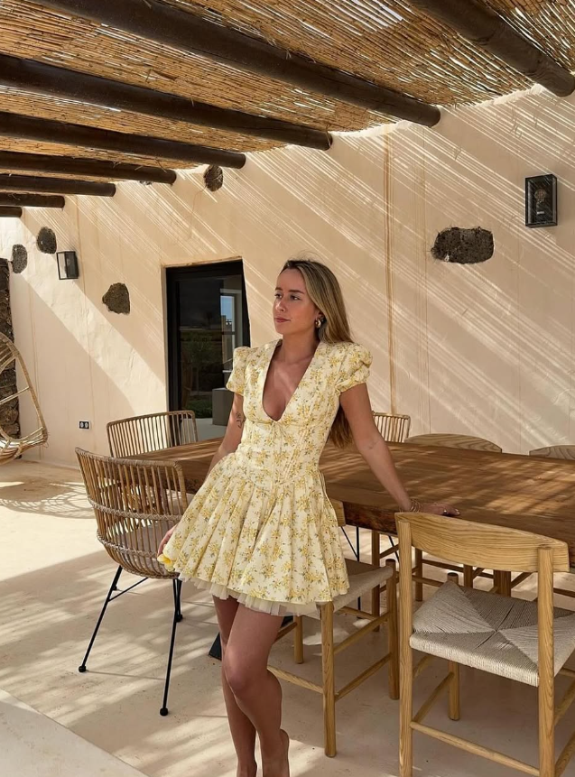 Princess A Line V Neck Print Flower Yellow Tulle Satin Short Homecoming Dress SH2127