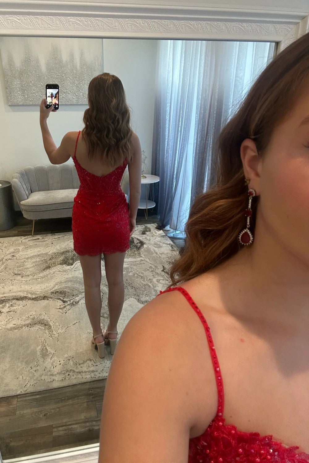 Sequin Lace Homecoming Dress with Spaghetti Straps and Keyhole Cutout