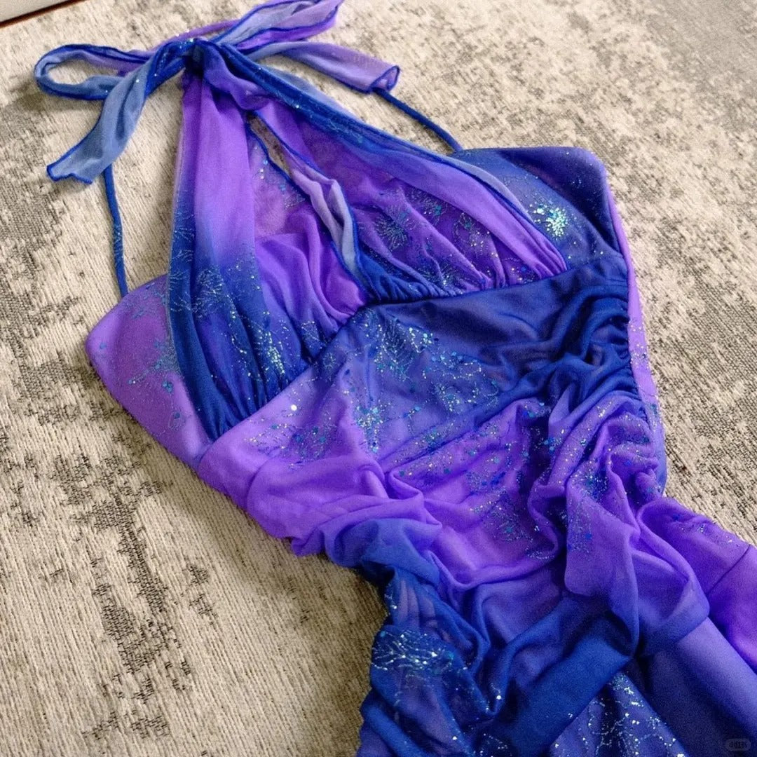 Sparkling Galaxy Chiffon Halter Neck Glitter Purple Prom Dress P3394