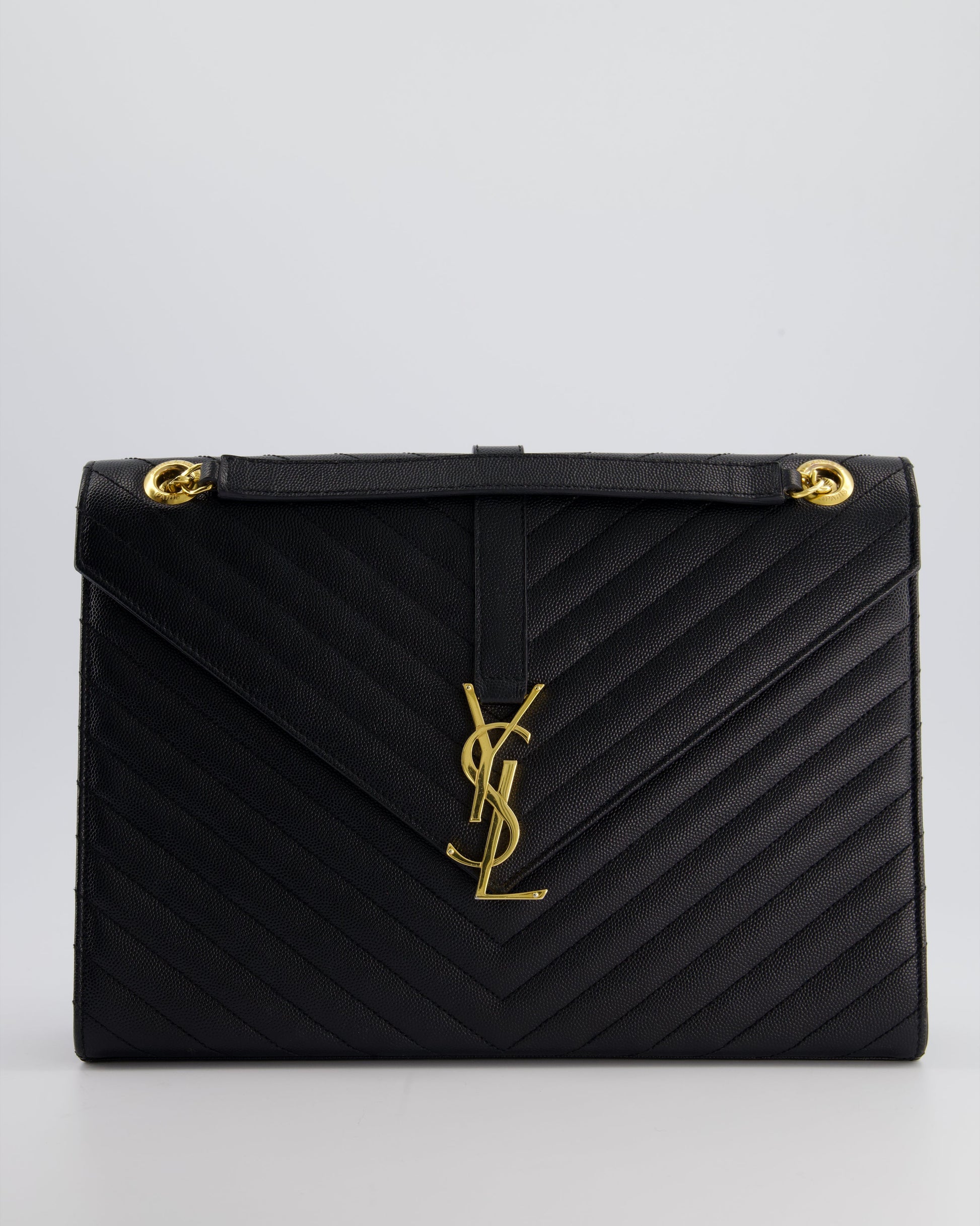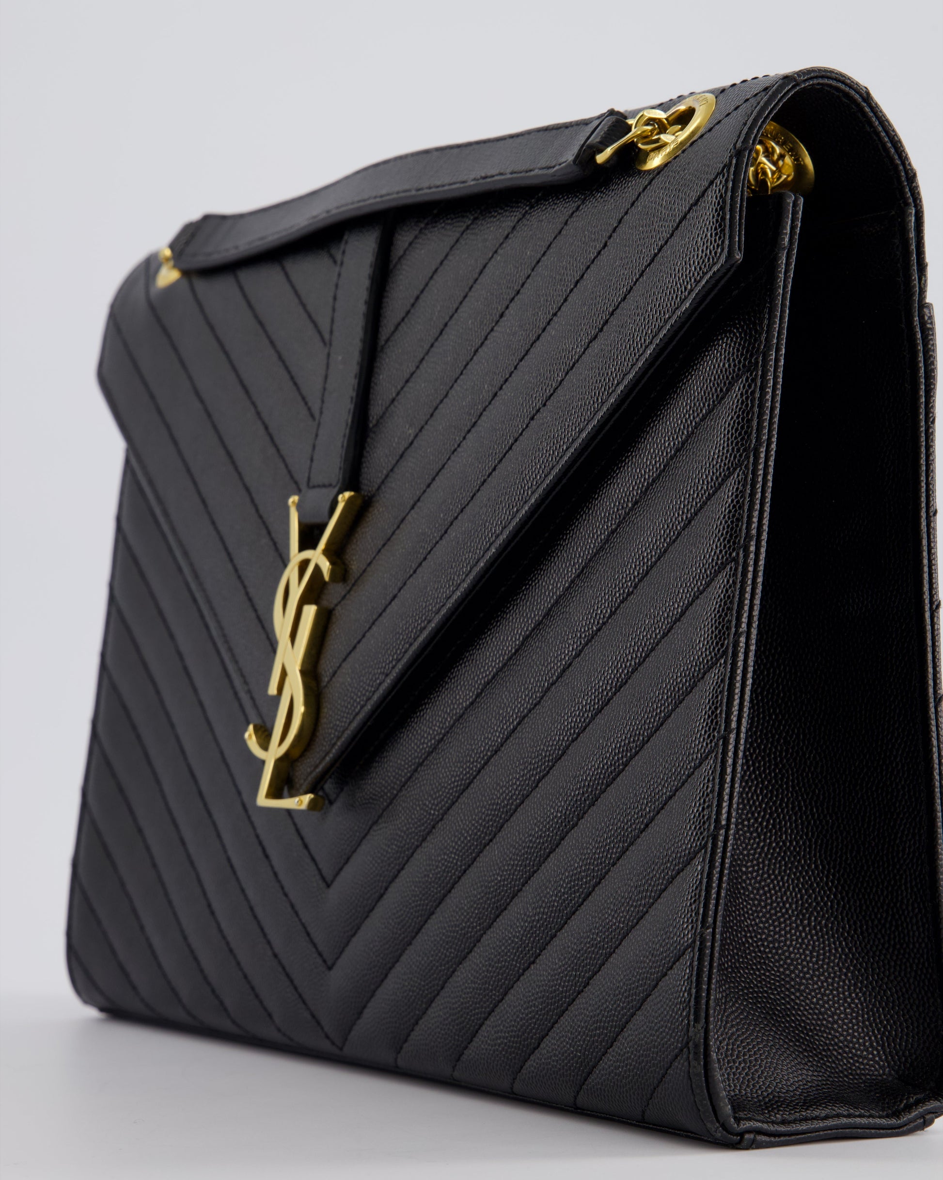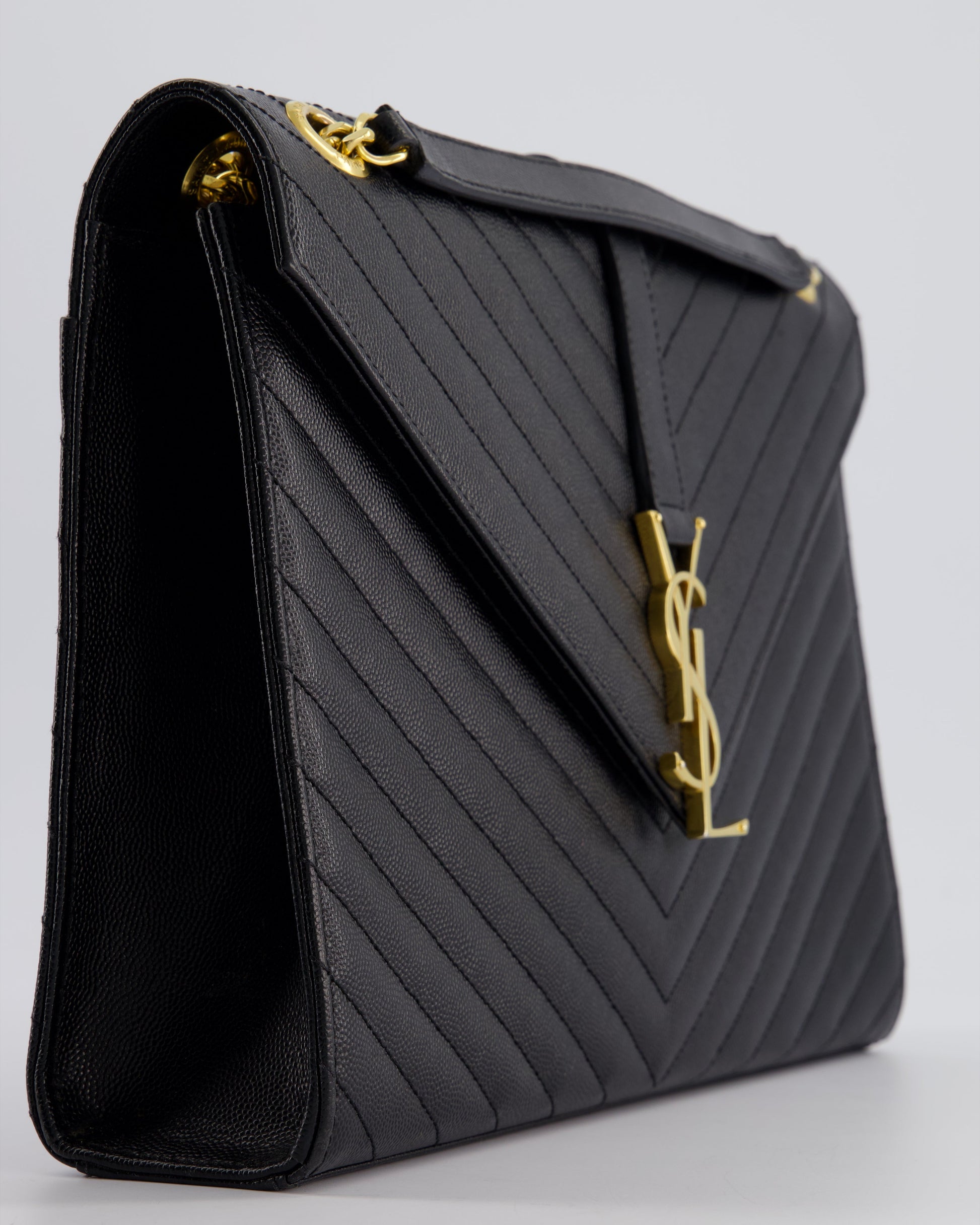 Saint Laurent Black Envelope Shoulder Bag in Grained Calfskin Leather With Gold Hardware